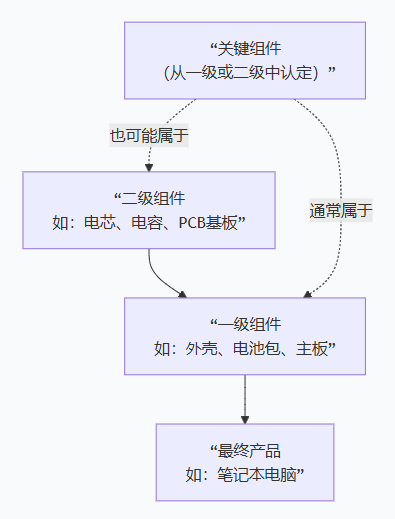 关键组件通常从一级或二级组件中认定。例如,笔记本电脑的主板(一级组件) 因其核心地位被认定为关键组件;而主板上的一颗中央处理器(CPU,可视为二级组件)更是关键中的关键。