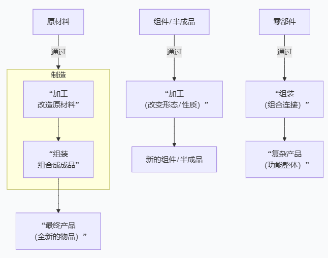 进货记录→制造/加工/组装记录:构成“投入物转化与价值创造”的证据。制造记录将具体的物料批次与特定的生产工序、产品批次相关联,证明了进口/国产料件如何通过境内的劳动、技术和工艺被消耗并转化为新产品。这是证明“实质性加工”发生过程的核心。