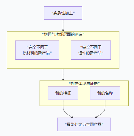 “实质性加工”创造了“新产品”,而“新特征”与“新名称”则是证明其存在的客观证据。