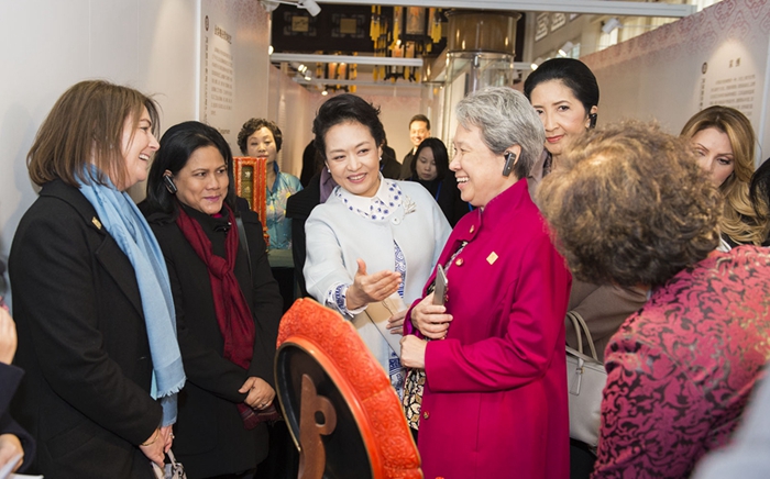 颐和园水木自亲殿内,彭丽媛与出席2014年APEC领导人非正式会议的部分经济体领导人或代表的夫人,观看了景泰蓝、花丝镶嵌、雕漆等非物质文化遗产展示。彭丽媛请夫人们体验景泰蓝的制作流程,尝试着为景泰蓝花瓶点蓝。夫人们纷纷惊叹景泰蓝工艺的精致和繁复。