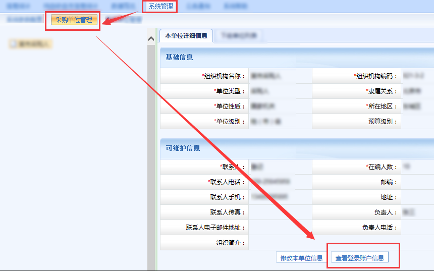 方法一,在左侧组织树找到下级单位并选中,然后点击查看登录账户信息。
