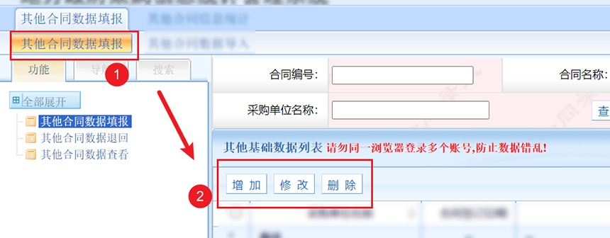 第二步,点击其他合同数据填报进行数据录入,由于其他合同只在年末录入,所以填报时不用选择数据期间,录入页面类似普通合同(其他合同不用录入合同编号与合同名称)。
