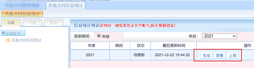第三步,点击其他合同信息统计生成报表(其他合同只有年报,没有季报),生成完成,检查数据无误后,点击上报按钮上报数据。