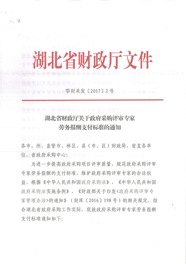为进一步提高政府采购项目评审质量,规范政府采购评审专家劳务报酬的支付标准,维护政府采购评审专家的合法权益,根据《中华人民共和国政府采购法》、《中华人民共和国政府采购法实施条例》、《财政部关于印发<政府采购评审专家管理办法>的通知》(财库〔2016〕198号)的相关规定,结合湖北省政府采购工作实际,现就政府采购评审专家劳务报酬支付标准通知如下:
